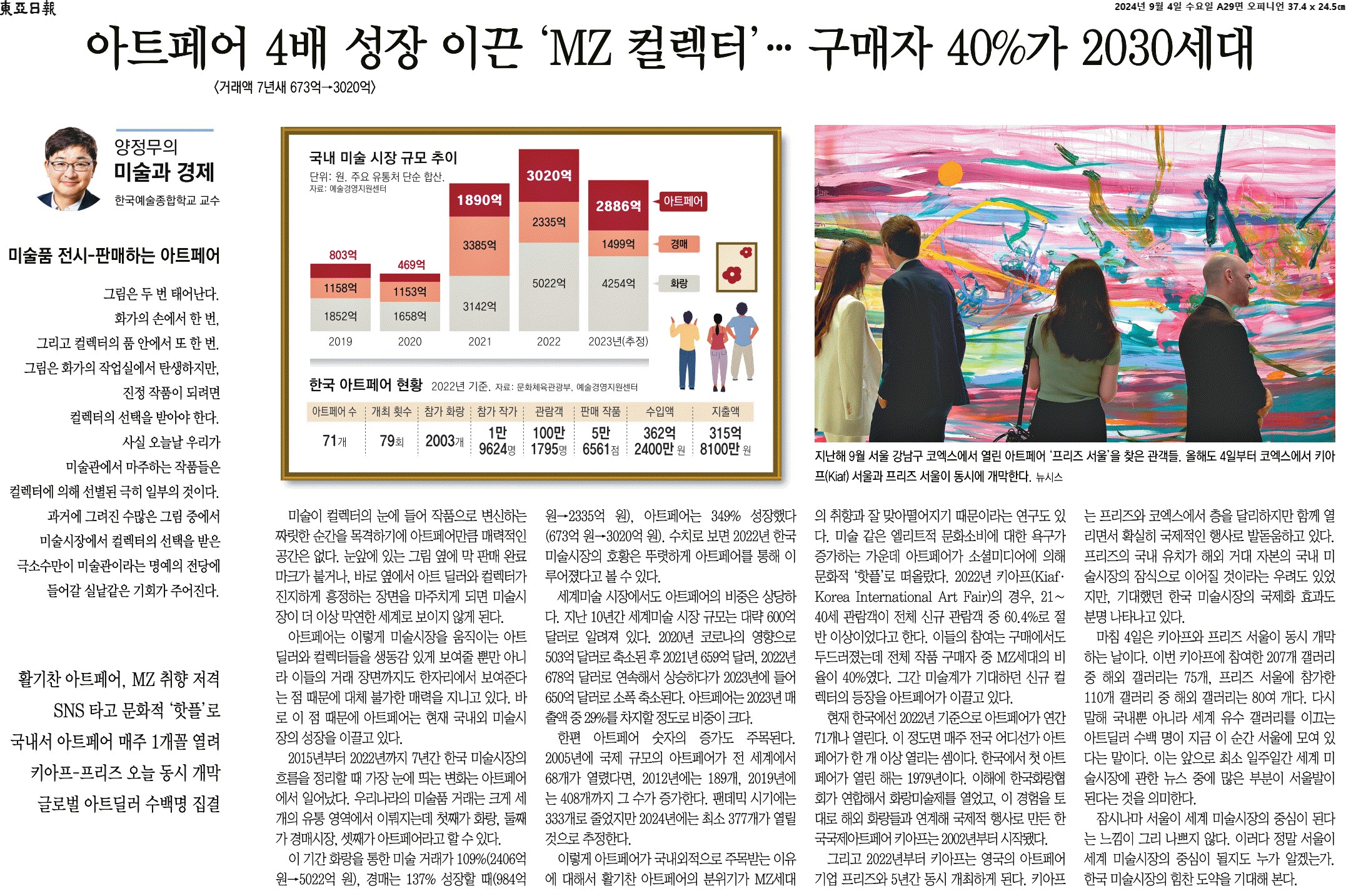④ 이렇게 아트페어가 국내외적으로 주목받는 이유에 대해서 활기찬 아트페어의 분위기가 MZ세대의 취향과 잘 맞아떨어지기 때문이라는 연구도 있다. 미술 같은 엘리트적 문화소비에 대한 욕구가 증가하는 가운데 아트페어가 소셜미디어에 의해 문화적 ‘핫플’로 떠올랐다. 2022년 키아프(Kiaf·Korea International Art Fair)의 경우, 21∼40세 관람객이 전체 신규 관람객 중 60.4%로 절반 이상이었다고 한다. 이들의 참여는 구매에서도 두드러졌는데 전체 작품 구매자 중 MZ세대의 비율이 40%였다.