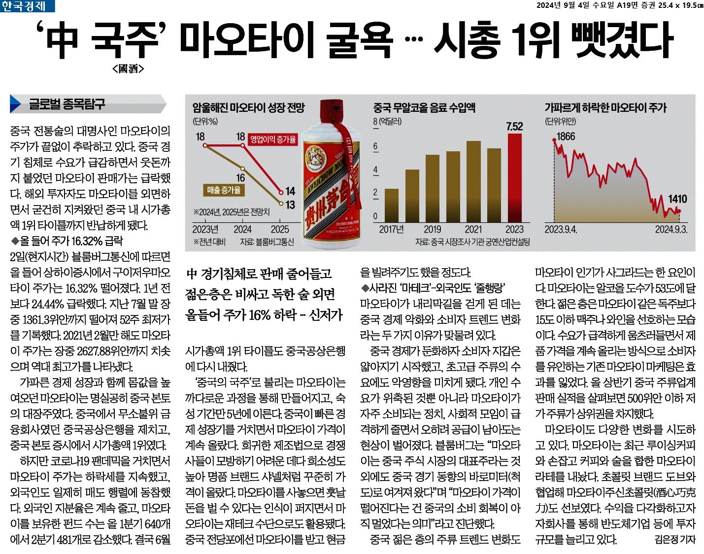 ④ 블룸버그는 “마오타이는 중국 주식 시장의 대표주라는 것 외에도 중국 경기 동향의 바로미터(척도)로 여겨져 왔다”며 “마오타이 가격이 떨어진다는 건 중국의 소비 회복이 아직 멀었다는 의미”라고 진단했다.