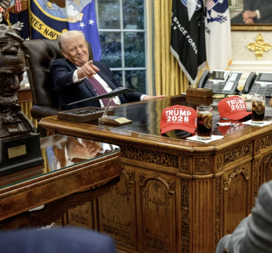 ① 도널드 트럼프 미국 대통령이 지난달 30일 연방정부 ‘셧다운(일시적 업무 정지)’을 막기 위해 민주당 지도부와 협상하는 자리에서 ‘TRUMP 2028’이라고 적힌 모자를 책상 위에 올려놓아 논란이 되고 있다. 이는 트럼프의 2028년 대선 3선 도전을 암시하는 문구다. ② 트럼프가 1일 자신의 소셜미디어 트루스소셜에 전날 백악관 집무실(오벌오피스)에서 진행한 여야 지도부와의 회동 사진을 3장 올렸다. 이들 사진에는 여야 지도부가 대화하는 모습이 담겼는데 책상 위에 흰색 글씨로 ‘TRUMP 2028’이라고 적힌 빨간 모자가 빠지지 않고 등장한다. 트럼프가 의도적으로 이를 노출하고 부각시킨 것이다. CNN은 이를 두고 “민주당을 향한 노골적 메시지”라고 평가했고, 뉴욕포스트는 “협상장을 조롱한 행위”라고..